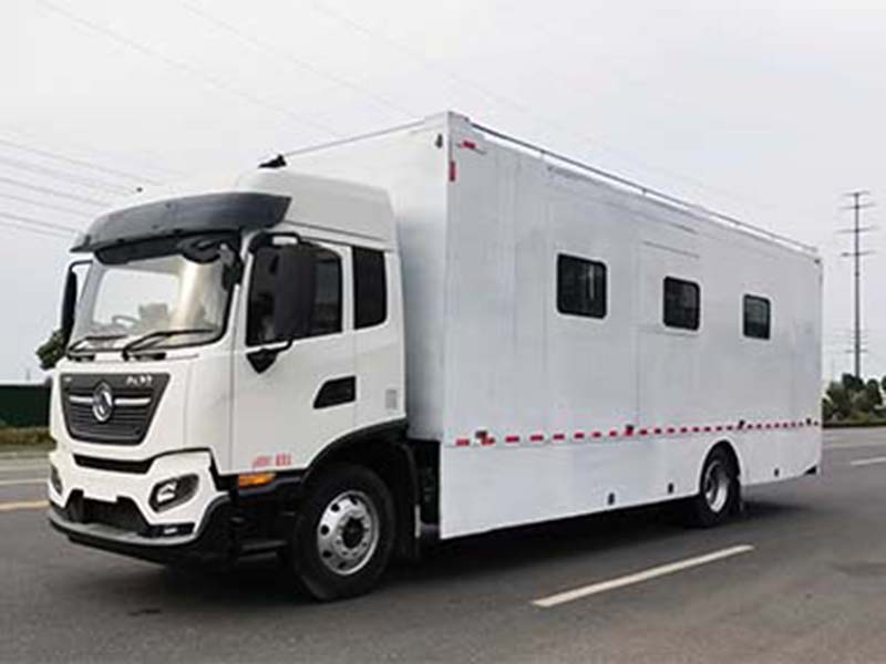 東風餐車長度約為10.28米,寬度為2.55米,高度為3.98米,后部箱體長約8米,箱體分為兩個部分,前部為發電機艙,發電機艙內安裝大功率發電機;后部為工作區,工作區內兩側安裝灶具和廚具設備,中間為過道,工作區兩側設置上下翻板,可拓展工作區的使用范圍,下翻板下部配備手動支腿和掛梯,方便工作人員使用。