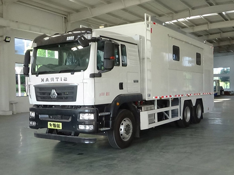 汕德卡餐車長度約為10.28米,寬度為2.55米,高度為3.98米,后部箱體長約8米,箱體分為兩個部分,前部為發(fā)電機(jī)艙,發(fā)電機(jī)艙內(nèi)安裝大功率發(fā)電機(jī);后部為工作區(qū),工作區(qū)內(nèi)兩側(cè)安裝灶具和廚具設(shè)備,中間為過道,工作區(qū)兩側(cè)設(shè)置上下翻板,可拓展工作區(qū)的使用范圍,下翻板下部配備手動支腿和掛梯,方便工作人員使用。
